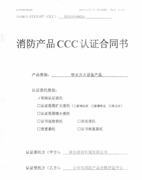 潍坊捷通(皆通)机械有限公司,本着"质量保障、诚信为本"的原则,响应国家监督检验检疫总局和国家认证认可监督管理委员会统一发布的《强制性产品认证管理规定》,3c认证进行中....!目前是潍坊沟槽管件厂家为数不多的厂家。